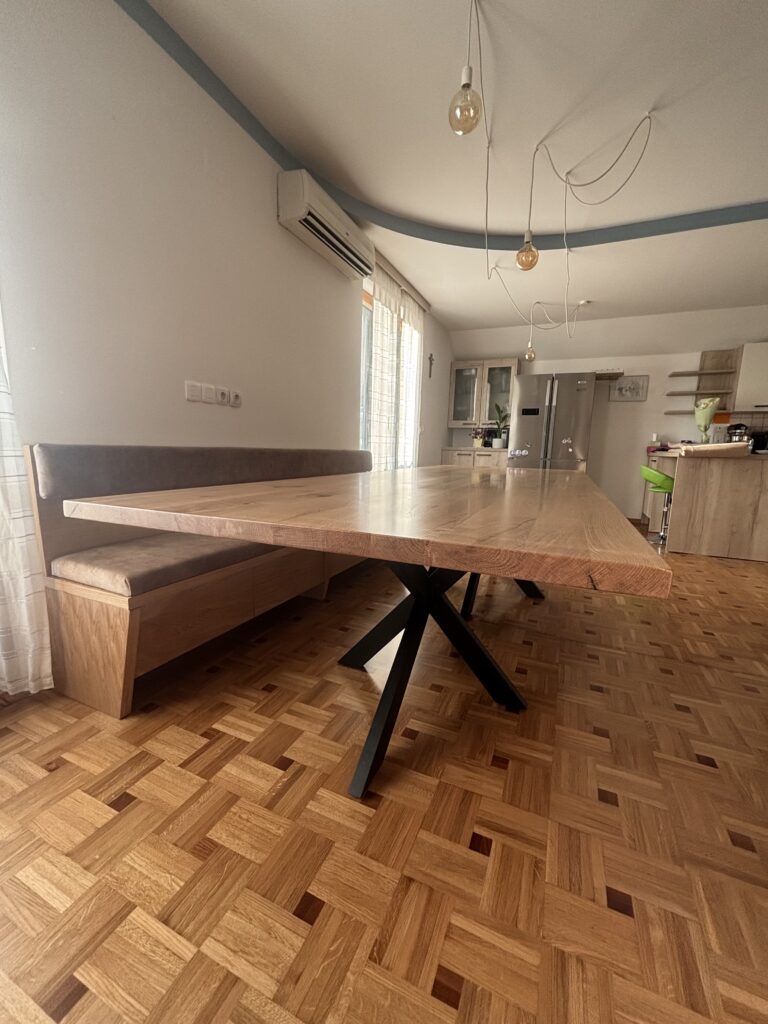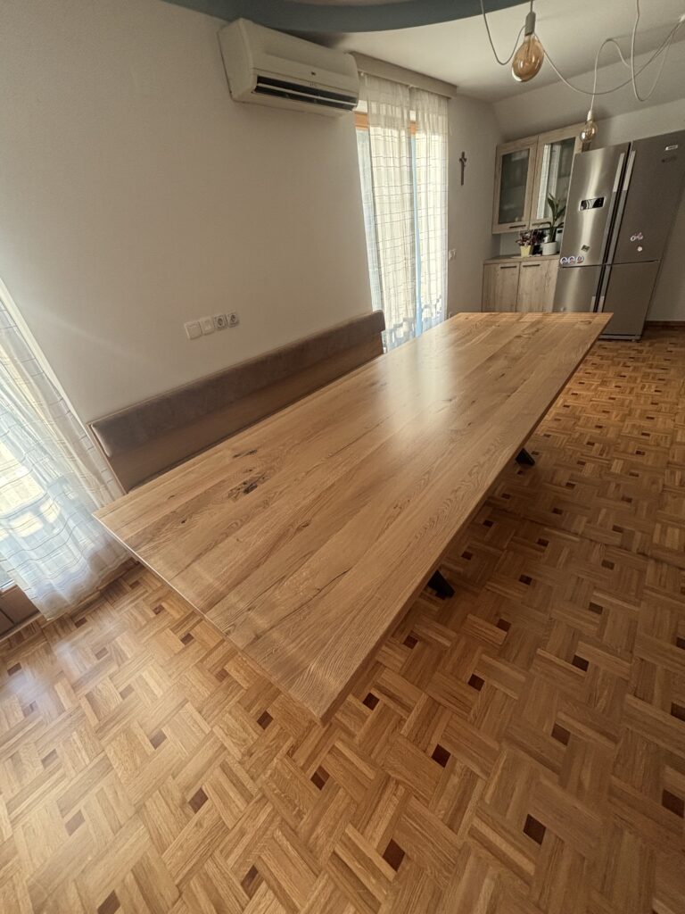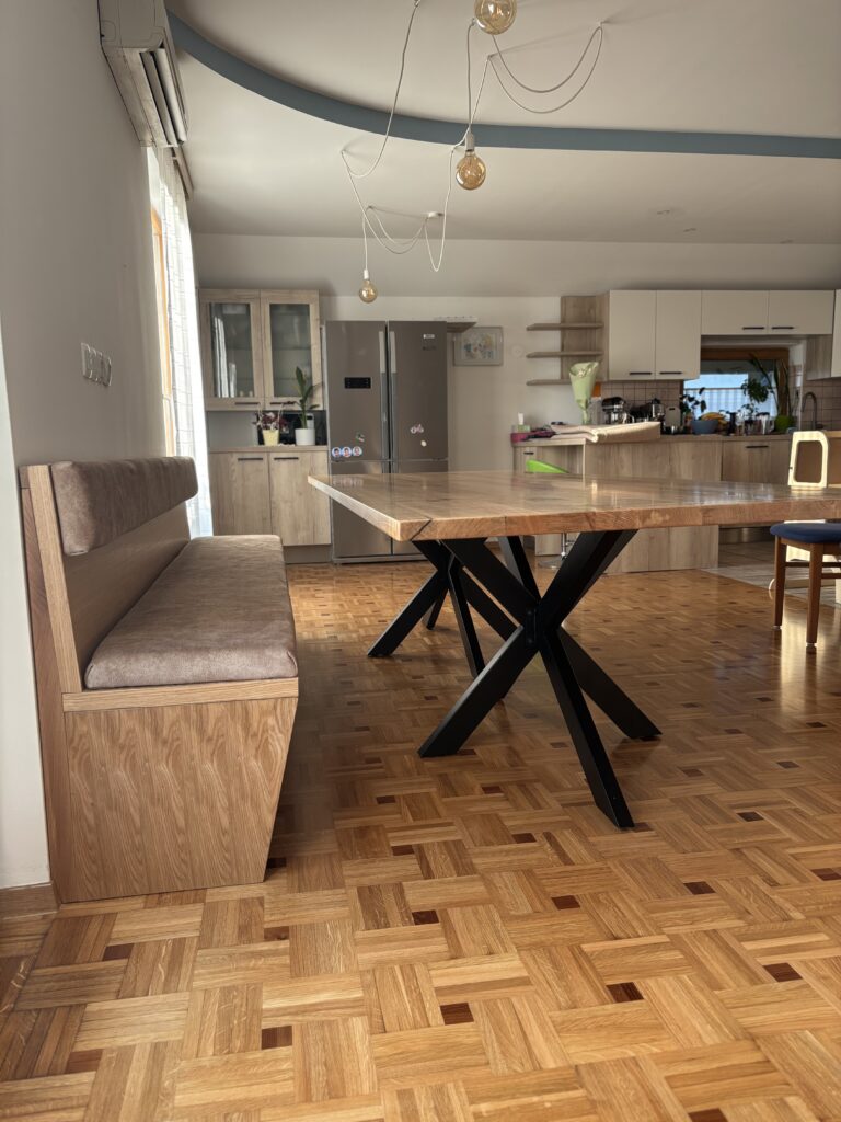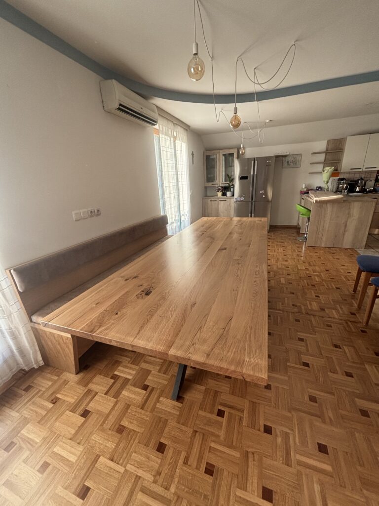 V podjetju smo izdelali unikatno jedilno mizo iz masivnega hrasta z integrirano klopjo po meri. Projekt združuje naravno toplino lesa, sodoben dizajn in funkcionalnost, prilagojeno prostoru.