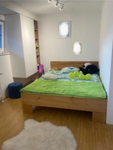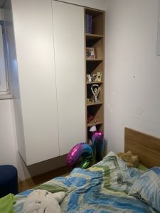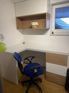 Funkcionalna in estetsko dovršena otroška soba z masivno hrastovo posteljo ter pohištvom iz bele in hrastove iverne plošče. Kombinacija pisalne mize, visečih omar nad mizo ter omar ob postelji omogoča optimalno izkoriščenost prostora in prijetno bivanje.