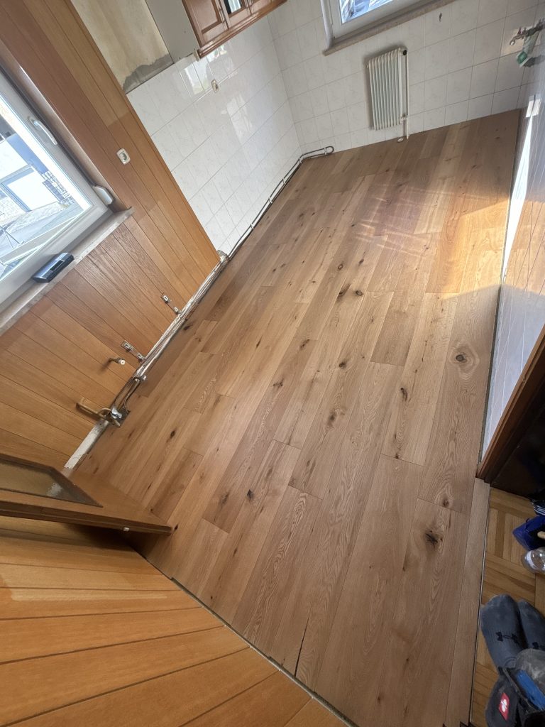 Sledila je izvedba novega tlaka, nato smo položili nov parket ter dodali zaključne letve za estetski videz. Na koncu smo zmontirali nazaj jedilni kot ter kuhinjo z novim pultom, ki prostoru daje svež, sodoben videz.